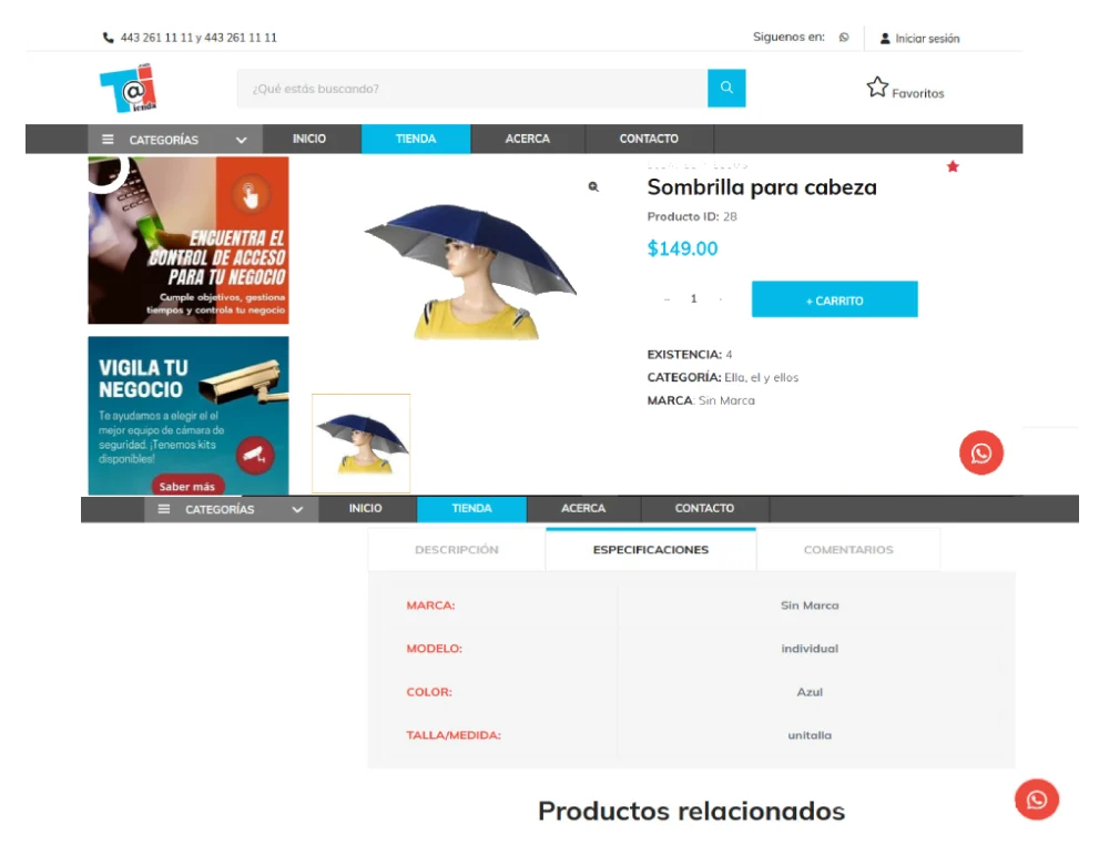 - Botones flotantes para llamada y mensaje WhatsApp.